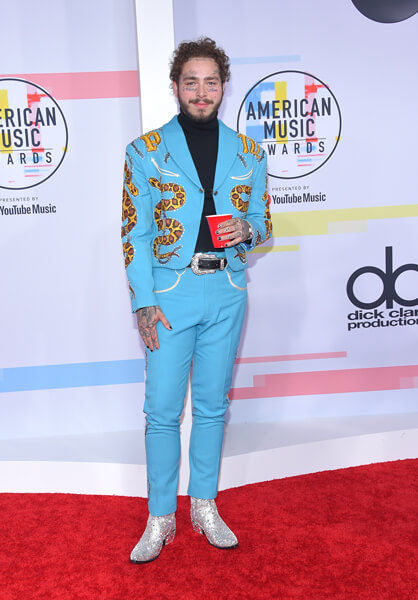 Post always seems like he's having a great time. He's just living life and I couldn't be happier with that. For the 2018 American Music Awards he brought his drink along for the red carpet. His baby blue suit with snake design and jewels is amazing on it's own. But add those boots? And the bedazzled belt? He will always be one of my favorites.