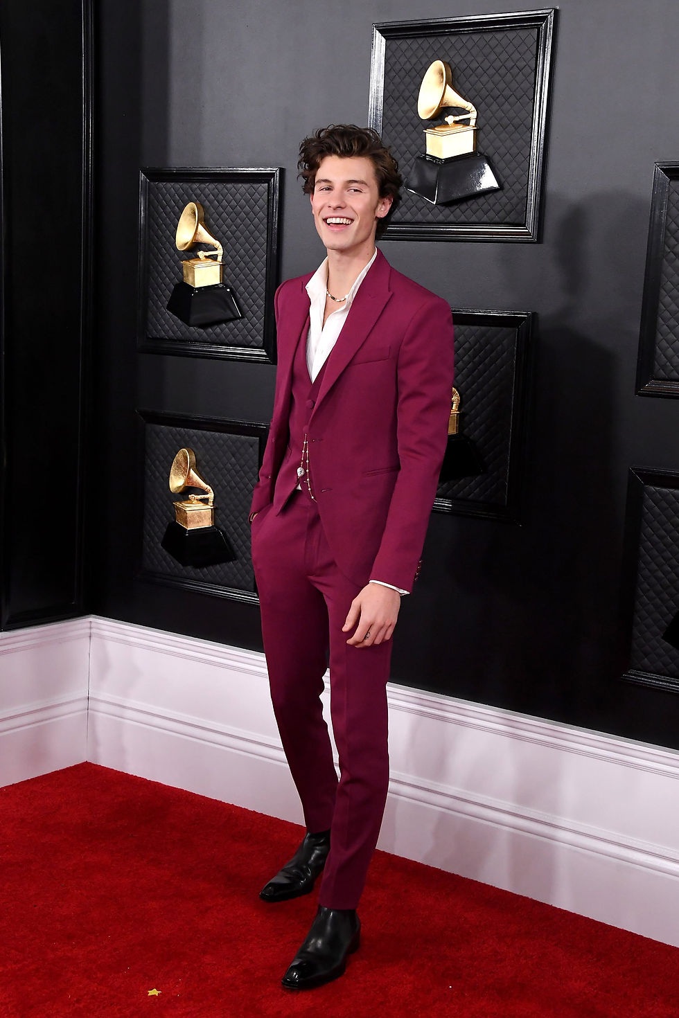 Shawn always seems to have an amazing suit for awards shows. All of them are fantastic but his 2020 Grammys look was my all time favorite of his. The raspberry suit with a white collared shirt under it was definitely a good decision. His necklace brought the look off to perfection. But I mean, when does Shawn wear a suit and not pull it off?