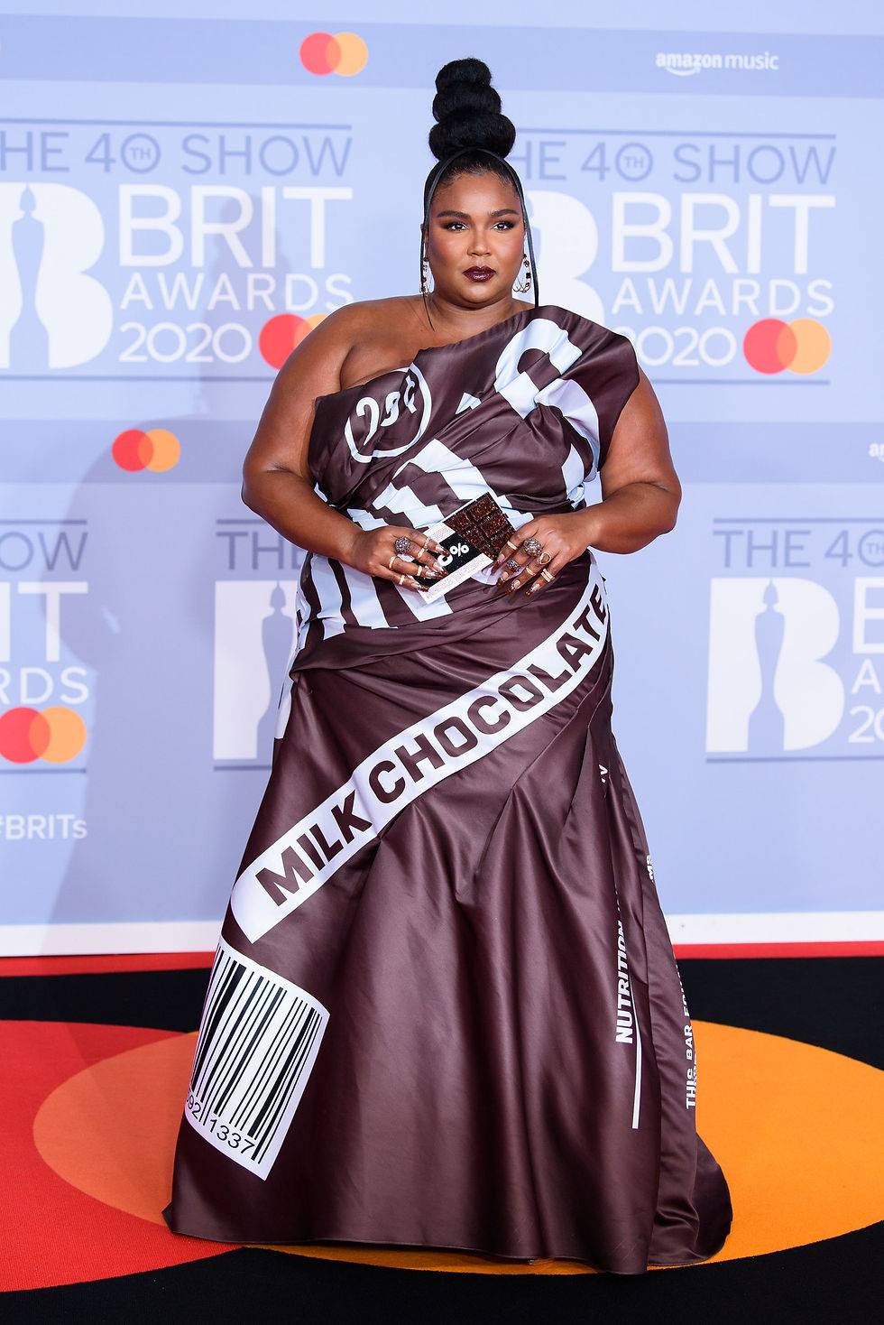 Lizzo always has us talking about her red carpet looks. Sometimes it's a tiny purse and sometimes it's a gown dedicated to chocolate. At the 2020 BRITs she dressed in a Hershey's chocolate dress! Not everyone can pull that off. But Lizzo being the queen she is rocked it.